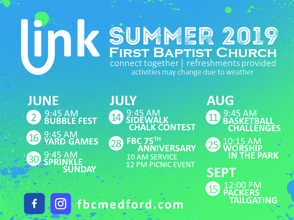 Connect together this summer! There will be no Sunday school between services this summer.  Instead, we are providing opportunities for connection with others within our FBC family. Why are we doing this? I’ve often heard FBCers express a desire to have more time to connect with their brothers and sisters in Christ. So, we asked ourselves, “Could we help make connecting easier?” That’s when our summer link opportunities were born.