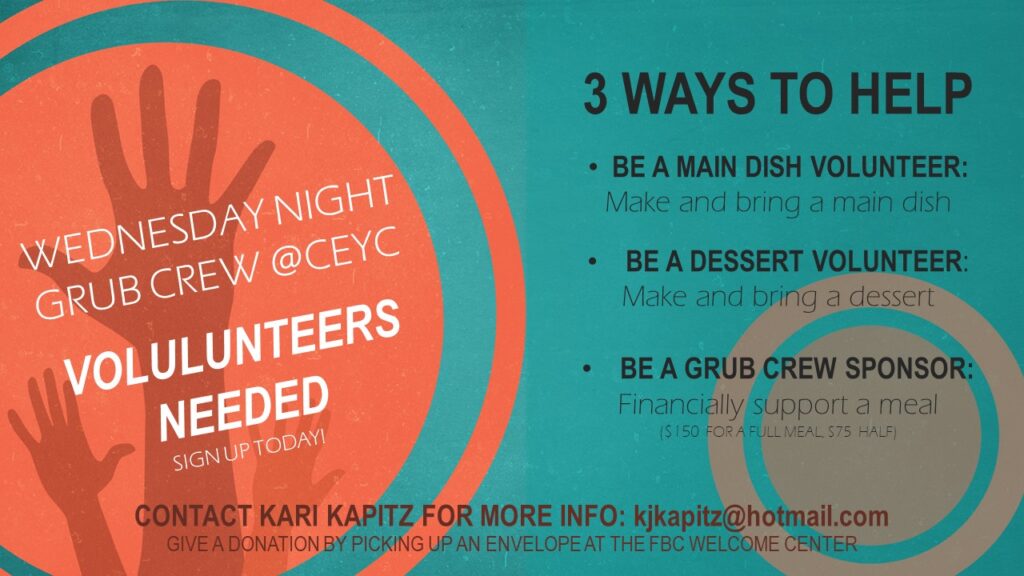 INTERESTED IN HELPING FINANCIALLY? Here are a couple ideas: $35 Pizza Sponsorship for Afterschool @CEYC, $75 Half Meal Sponsorship for Grub Crew, $150 Full Meal Sponsorship for Grub Crew. We welcome any financial gift you would feel led to give. You can find an envelope to put your donation in at the Welcome Center at FBC and then drop it in the Communication Box.