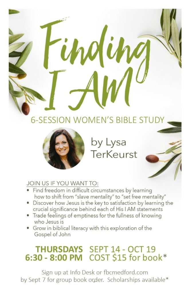 Finding I Am Date October 19, 2017 Time 6:30 PM – 8:00 PM Address 670 W Broadway Ave Medford, WI 54451 Directions Venue First Baptist Church, rear entrance Category Bible Studies, Women's Ministry SIGN UP HERE SIGN UP HERE